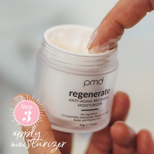 Swipe a liberal amount of Regenerate: Anti-Aging Recovery Moisturizer to both sides of the face. No need to rub it in just yet!