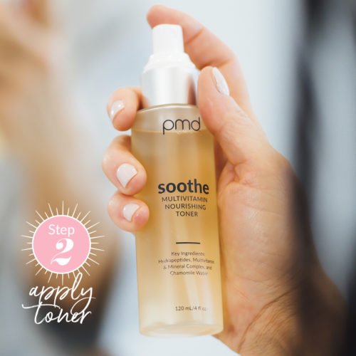 Spray Soothe: Multivitamin Nourishing Toner over face, neck, and décolleté for a vitamin refresher.