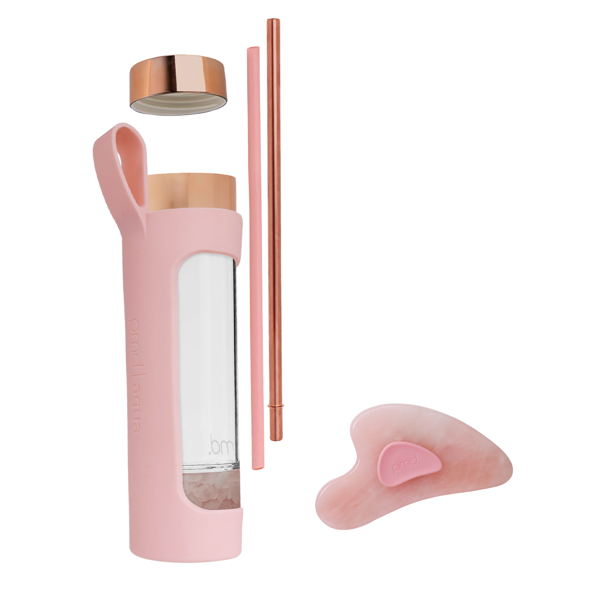 Rock your love of rose quartz with the PMD Aqua Water Bottle with accessories and the PMD Gua Sha RQ.