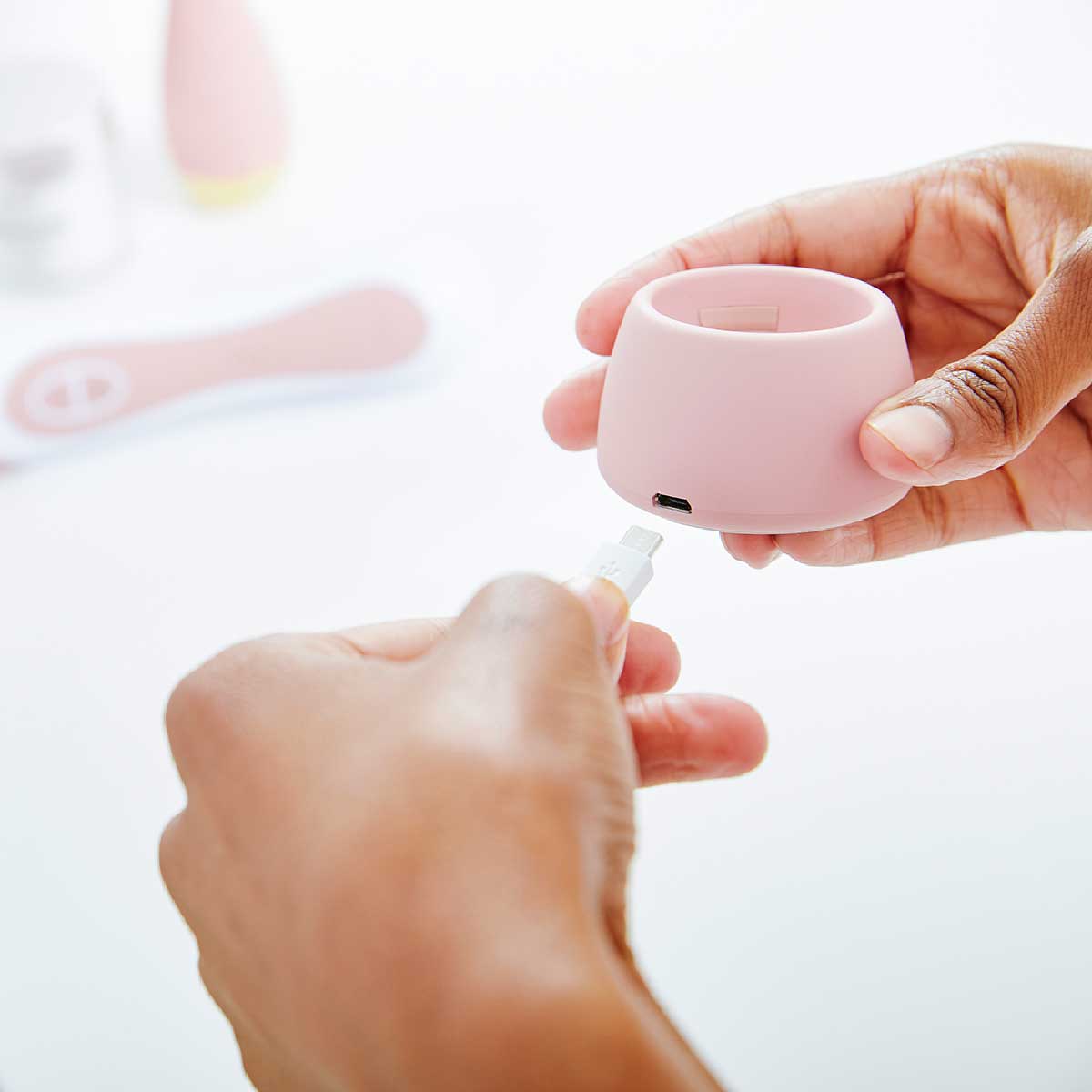 The charging port for the Personal Microderm Elite Pro can be found at the back of the charging base